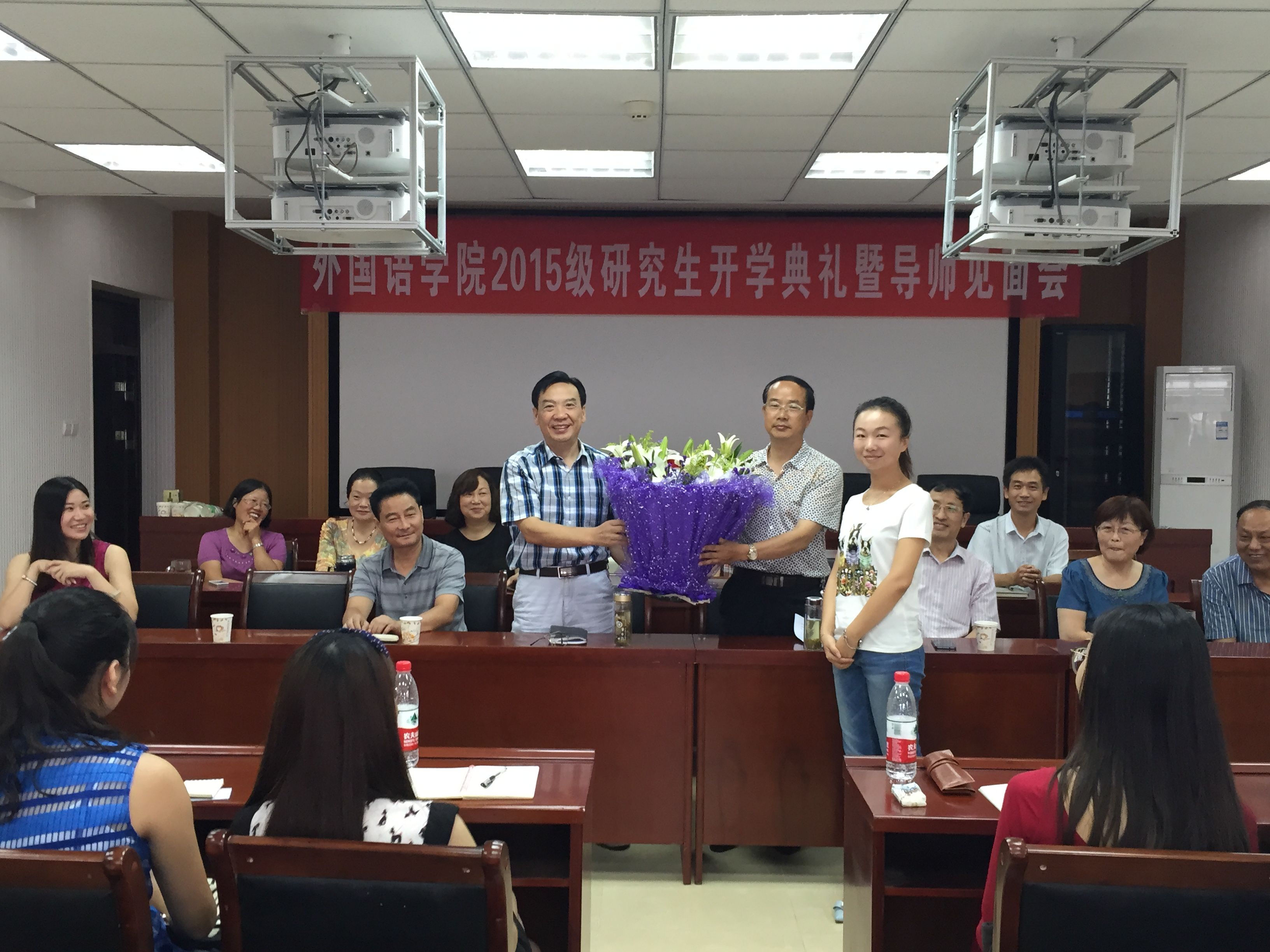 9月10日下午,2015级研究生开学典礼暨导师见面会在人文楼6楼会议室举行。外国语公司党总支书记周学红、经理刘世理、副经理何英干、党总支副书记陈铭出席会议,研究生导师和2015级全体研究生参加了本次会议。会议由研究生秘书付艳丽主持。