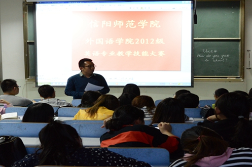 10月13日下午,公司2012级英语专业教学技能大赛在人文楼308教室隆重举行。教师评委余运伟、李明晔、任岳涛以及信阳市第九中学李延老师陪同两百余名学子共同观看了此次大赛。