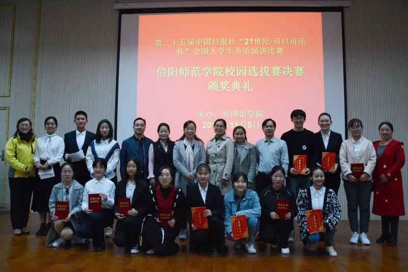 由beat365亚洲体育官方网站承办的第二十五届“21世纪·可口可乐杯”全国老员工英语演讲比赛河南赛区信阳师范公司校园选拔赛于2019年11月5日圆满落幕。beat365亚洲体育官方网站副经理姚光金、教师代表崔淑丽、傅翀、李明晔、余运伟、张瑞、宋冬梅、张倩担任评委,近三百名师生观摩了此次比赛。公司党委副书记柏孟仁和副经理姚光金共同为获奖选手颁奖。