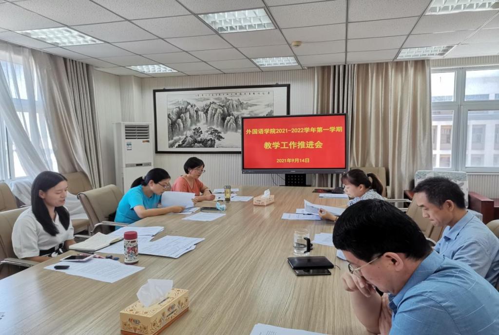 9月14日下午,beat365亚洲体育官方网站在人文楼五楼会议室召开了2021-2022学年第一学期教学工作推进会。英语系主任余运伟、日语系主任张鸿鹏、翻译系副主任曹万忠、商务英语系主任吴倩、第二外语教研室主任傅翀及教务办工作人员共同参加了会议。会议由副经理郭敏主持。