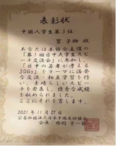 近日,由日中交流协会举办的中日老员工演讲比赛在日本东京都港区隆重举行,本次中日老员工演讲比赛面向全日本招募参赛选手,公司beat365亚洲体育官方网站日语系在日交换生贾子卿从230余名参赛选手中脱颖而出,突破层层选拔,成功晋级为本次演讲比赛的决赛选手。本次演讲比赛由一名日本老员工和一名中国老员工组成一组,以“年轻人的可持续性发展”为题每组各自互相交流学习三个月之后参加演讲比赛,发表自己的观点。贾子卿和一名来自和歌山的日本女老员工组成一组,演讲中贾子卿同学提出的“男女平等”“容貌焦虑”等主题获得与会评委的一致好评,最终荣获本次演讲比赛的第三名。