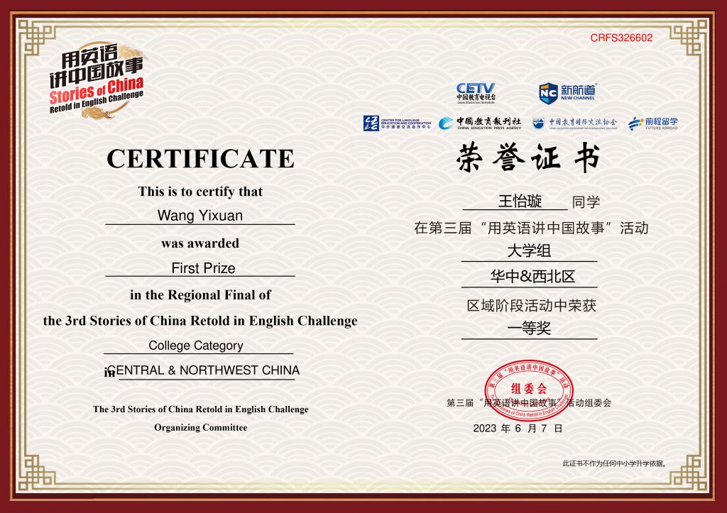 近日,由中国教育电视台、新航道国际教育集团主办的第三届“用英语讲中国故事”华中和西北赛区阶段赛圆满拉下帷幕。2020级英语专业王怡璇同学经过层层选拔脱颖而出,在华中和西北区大学组比赛中荣获一等奖,于淼老师被评为“优秀指导教师”。