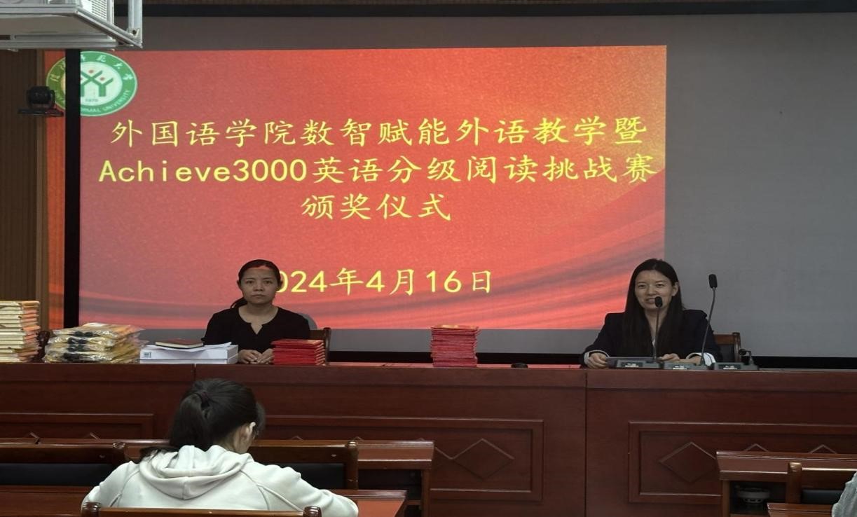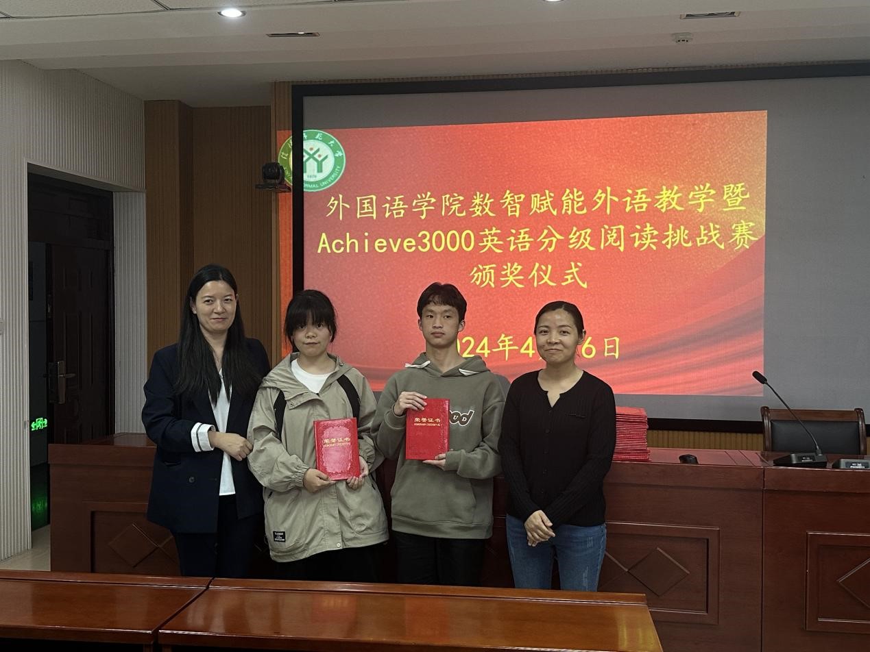 4月16日下午,beat365亚洲体育官方网站数智赋能外语教学暨Achieve3000英语分级阅读挑战赛颁奖仪式在人文楼6楼会议室举行。beat365亚洲体育官方网站副经理郭敏和英语系阅读大赛指导教师孙媛园出席颁奖仪式,为获奖选手颁发了证书和奖品。