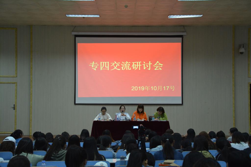 10月17日晚,beat365亚洲体育官方网站在人文楼报告厅召开专四经验交流会,优秀员工代表李白鸽,王彦淇,姜珂欣,郑玉燕及2018级全体员工参与本次会议。