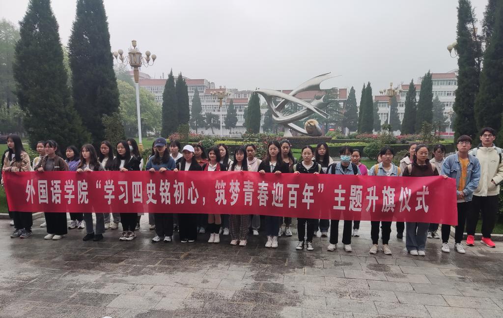 4月26日早晨,beat365亚洲体育官方网站组织2020级全体员工在公司行政楼前举行“学习四史铭初心筑梦青春赢百年”主题升旗仪式。外国语公司党委副书记柏孟仁、辅导员郗金月参加了升旗仪式。