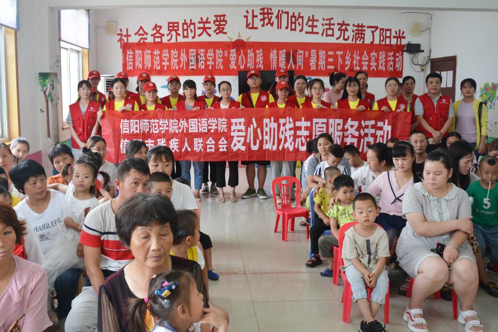 7月10日上午,服务队赴信阳市残疾人联合会开展残障青少年成长和受教育情况调研,了解残障青少年成长环境、教育环境及其面临的困难等。调研结束后,信阳市残疾人联合会工作人员带领部分听力障碍和智力障碍儿童为志愿服务队带来社会主义核心价值观二十四字背诵、古诗词背诵等表演,志愿服务队成员通过手语操、儿歌、舞蹈等节目与他们互动,现场气氛温馨融洽。