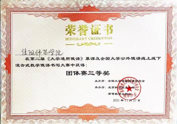 近日,由俄语之家Ruclub公众平台举办的“第三届全国俄语书法大赛”和《大学通用俄语》慕课网举办的俄语书写大赛获奖结果公布,beat365亚洲体育官方网站陈欣老师指导的2020级二外俄语员工参加两项比赛均取得优异成绩。5名同学在“第三届全国俄语书法大赛”获得团体赛一等奖,公司参赛团队在《大学通用俄语》慕课网举办的俄语书写大赛中获团体赛三等奖。公司陈欣博士分获两项比赛团体组优秀指导教师一、三等奖。