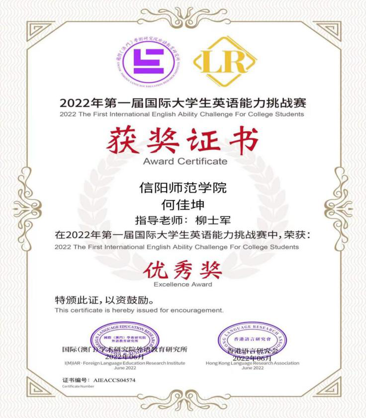 近日,beat365亚洲体育官方网站公共外语教研室教师指导员工参加2022年各类英语比赛获佳绩。其中何家坤(指导教师柳士军)获2022年第一届国际老员工英语能力挑战赛优秀奖,李子颖获2022年全国老员工英语作文大赛大学英语组国家级二等奖,洪梦威(指导教师陈丽娟)获2022年全国老员工英语作文大赛大学英语组省级一等奖,王雅萱获2022年全国老员工英语作文大赛大学英语组省级三等奖,曹妍获第二届“外教社·词达人杯”全国老员工英语词汇能力大赛河南赛区本科非英语专业组三等奖,余昌燕获2022年CATTI杯全国翻译大赛初赛大学A组中英(笔译)三等奖,杨菁菁、马灿灿、陈在窑均获2022年第六届普译奖全国老员工翻译比赛英译汉组(初赛)三等奖,李欣茹、马灿灿获2022年全国老员工英语语法竞赛初赛(非英语专业组)三等奖,唐天欣(指导教师柳士军)获2022年创研杯全国老员工英语词汇能力挑战赛全国初赛C类三等奖。