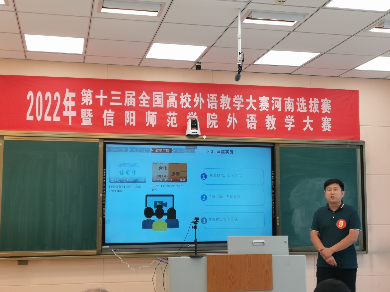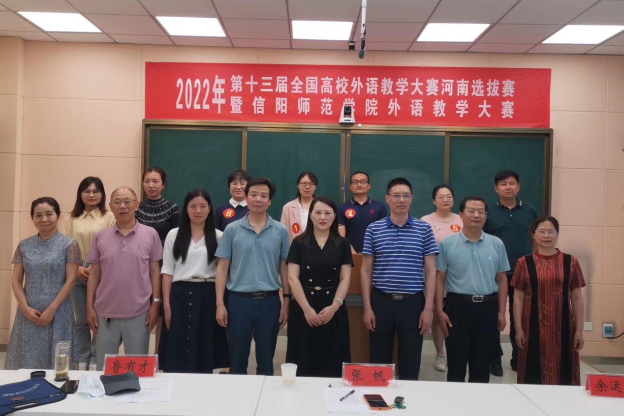 6月7日,第十三届全国高校外语教学大赛河南省高校选拔赛暨信阳师范公司外语教学大赛在人文楼603隆重举行。本次大赛致力于推动大学外语教学改革与创新,促进教师专业发展,提高外语教学质量,助力培养员工国际传播力意识,为中青年教师搭建学习和交流平台,建设一支高素质、创新型、擅表达的外语教师队伍。本次校园选拔赛由教务处主办,beat365亚洲体育官方网站承办。教务处副处长张帆莅临比赛现场指导工作并担任评委;beat365亚洲体育官方网站全体督导专家担任评委,外国语公司党委书记陈铭,经理蔡满园,副经理吴向东、余永锋、郭敏及部分教师代表共同参加了本次活动。大赛依托腾讯会议平台,向全院师生进行了直播。