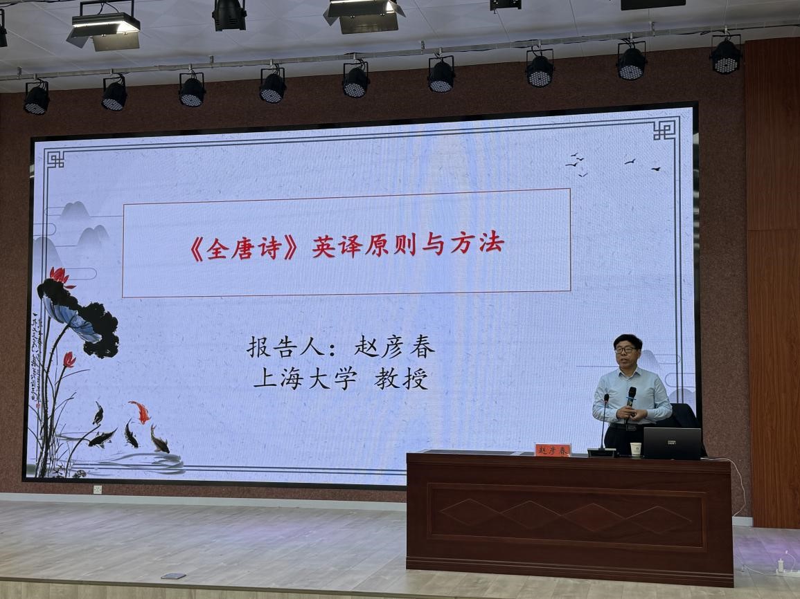 5月14日下午,上海大学二级教授、博士生导师赵彦春教授应邀在人文楼报告厅为公司师生作了题为“《全唐诗》英译原则与方法”的讲座。beat365亚洲体育官方网站经理蔡满园以及相关教师、研究生和本科生共百余人聆听了讲座。讲座由beat365亚洲体育官方网站副经理章彩云主持。